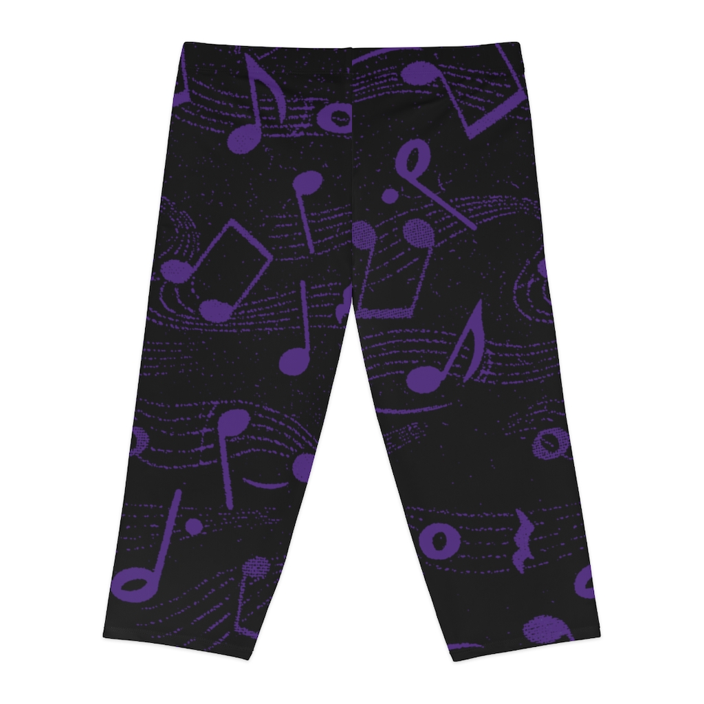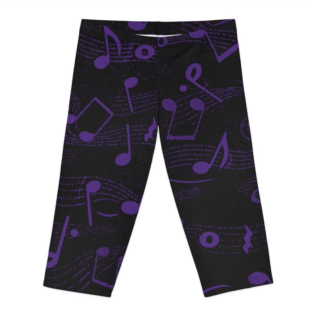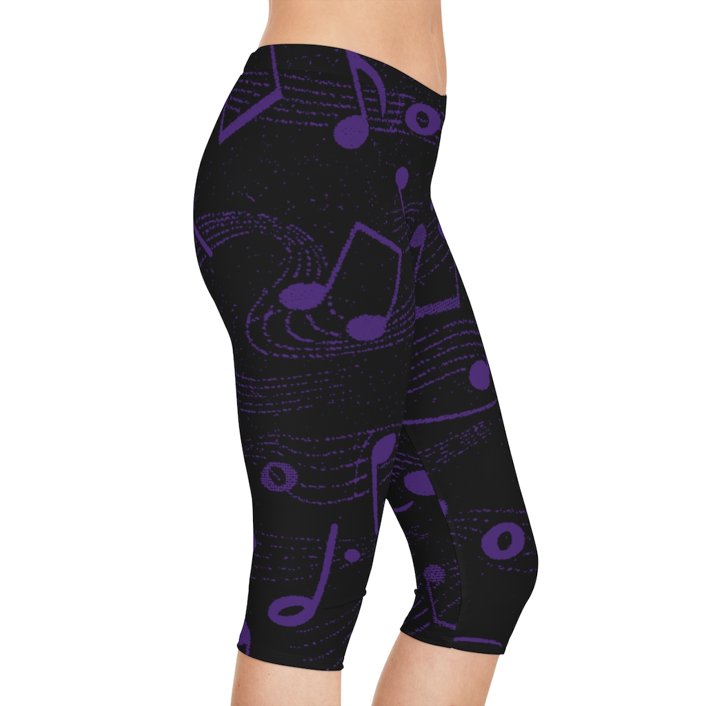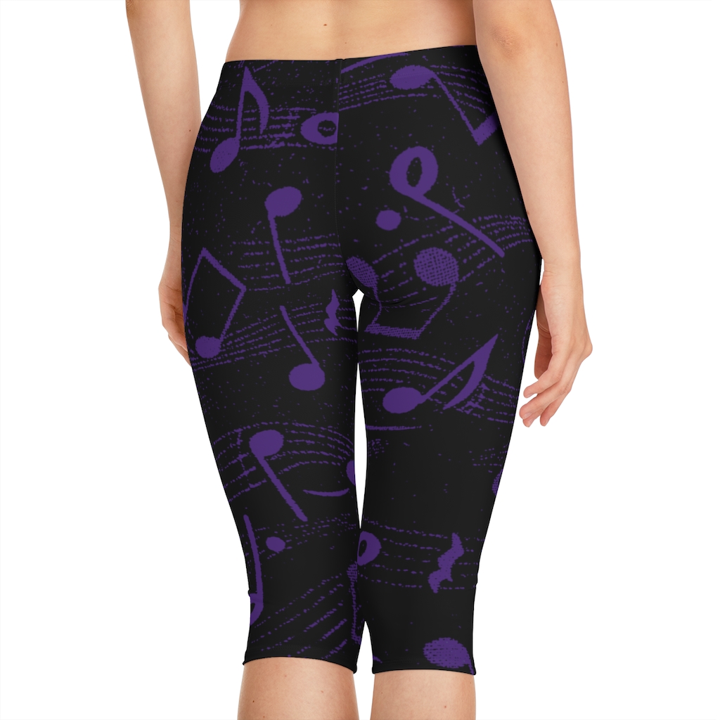 Women’s Capri Leggings Purple on Black Music Notes