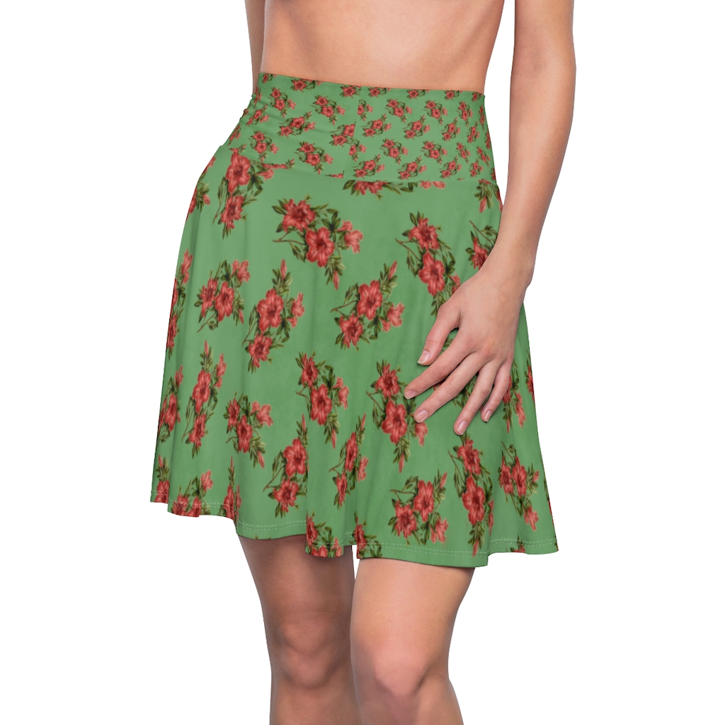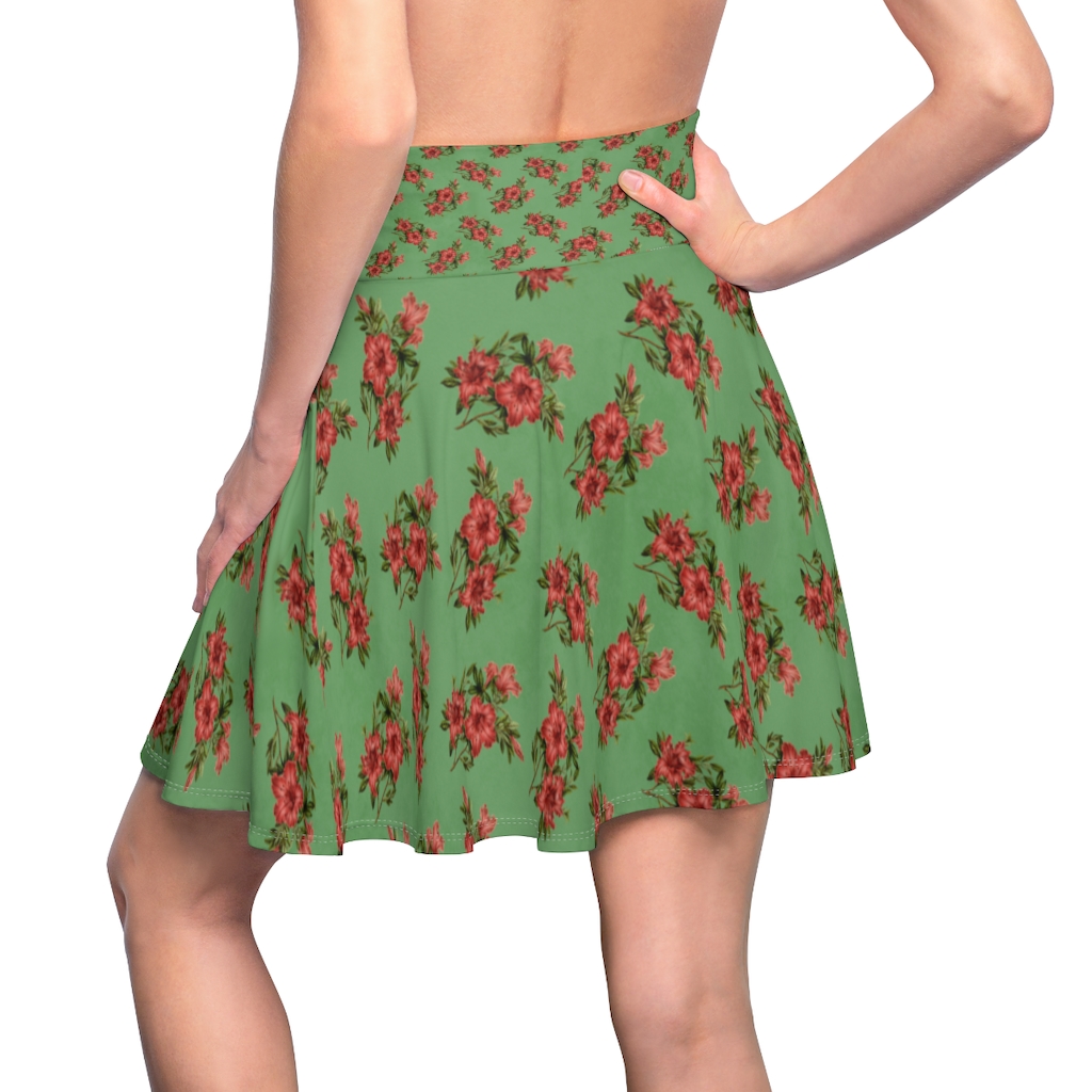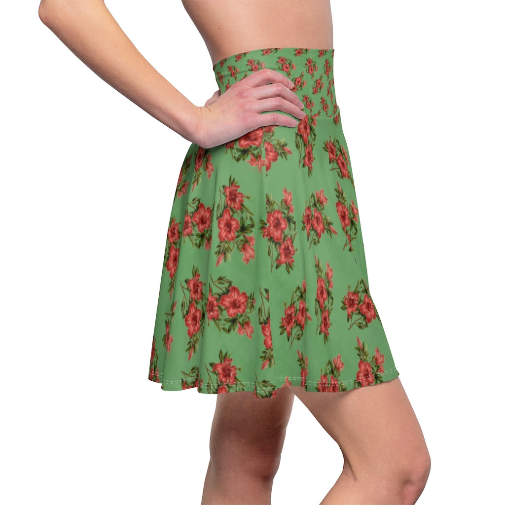 Women’s Skater Skirt – Red Flowers on Green